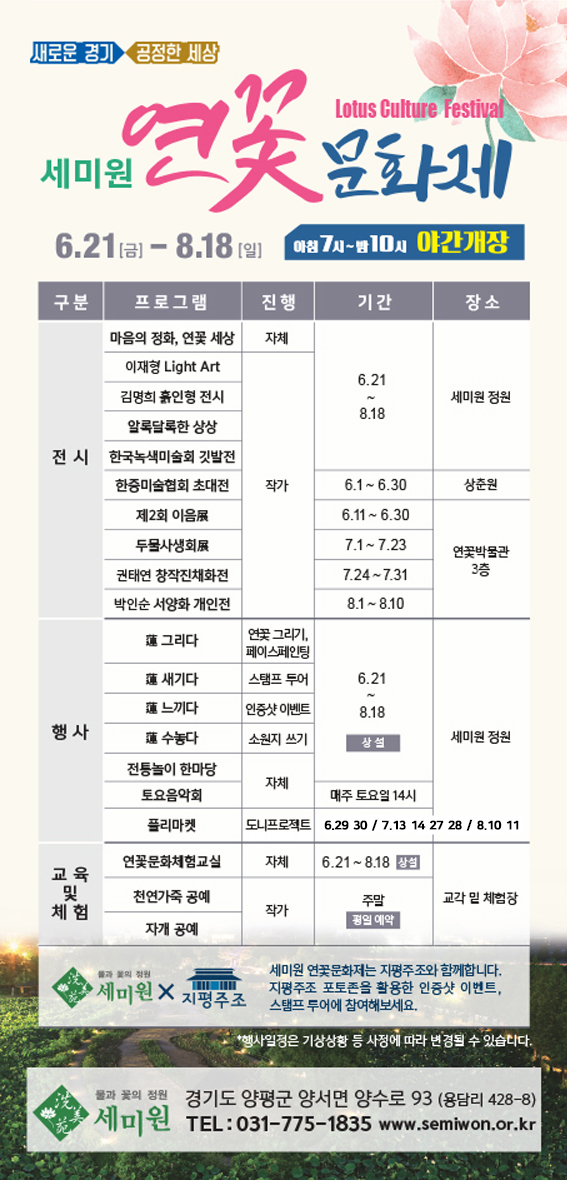 경기도 양평에 있는 세미원에서 축제가 열린다. 바로 오늘부터 8월 중순까지 <연꽃문화제>가 이어진다.