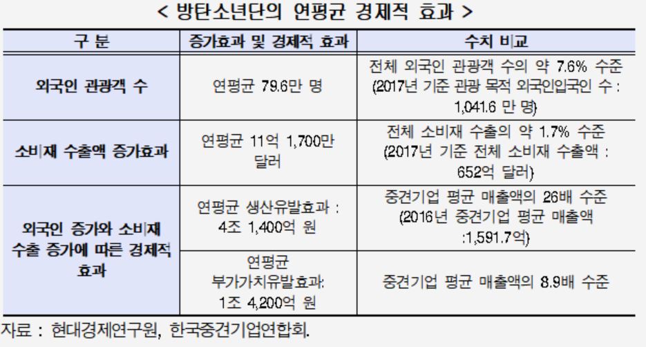 2018년 현대경제연구원에서 방탄소년단의 인기 상승이 외국인관광객수 및 주요 소비재수출액 증가 채널을 통해 국내 경제에 미친 파급 효과를 추정해 연구보고서를 만들었습니다.